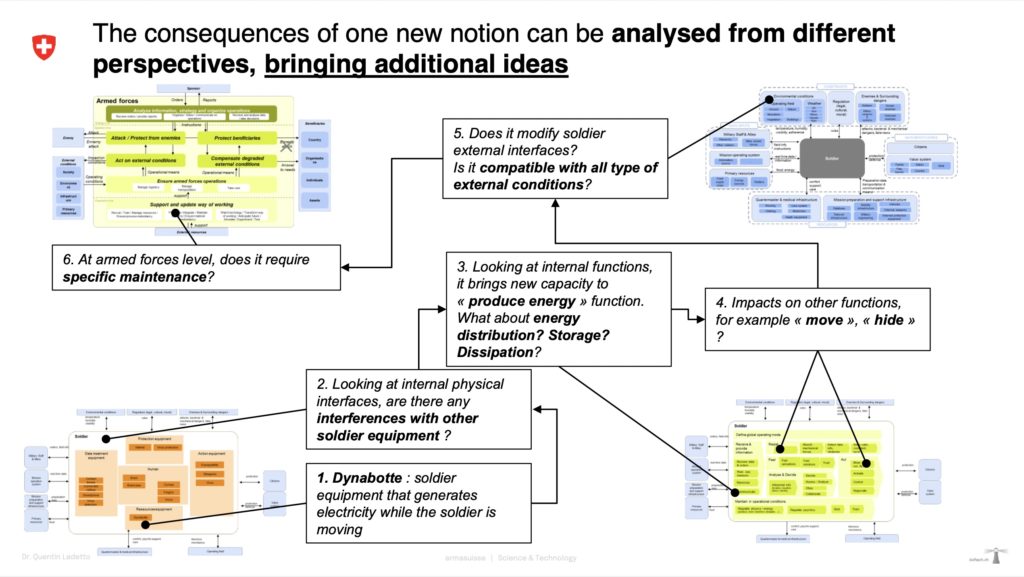Dans cette optique, nous avons prototypé cette utilisation du modèle systémique comme une armoire de rangement, en classant les différents concepts du dictionnaire du soldat du futur dans le modèle systémique. Ce travail a révélé aussi bien les zones bien explorées et les zones d’ombre. Il permet également de fournir une clé de lecture structurée à cette liste de concepts.