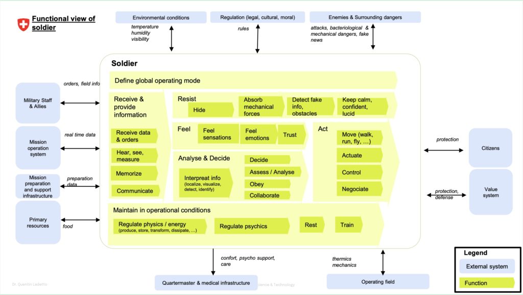 Pour ce faire, nous avons révisé notre méthode de travail. Nous avons construit une représentation systémique du soldat, c’est-à-dire un modèle permettant en un coup d’œil de répondre à 3 questions: