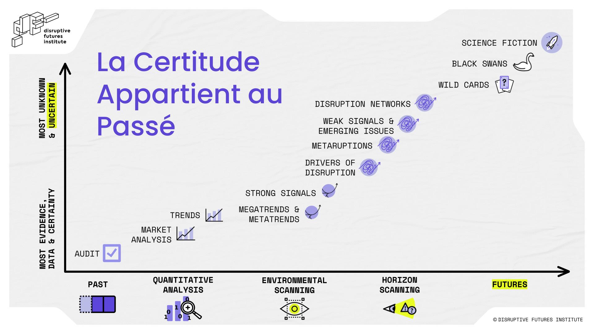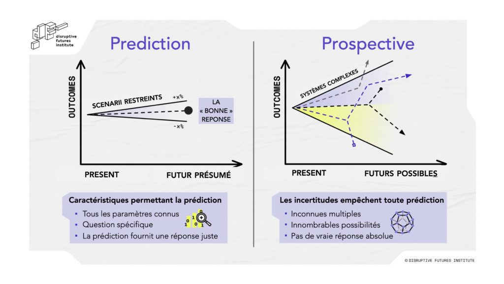 La mentalité prospective n’exclut pas l’utilisation d’hypothèses. Cependant, avec la prospective, nous ne cherchons pas à obtenir une réponse prédéterminée ou un résultat spécifique. La prospective est la capacité d’explorer les futurs possibles de manière systémique, ainsi que les moteurs du changement permettant d’éclairer la prise de décision à court terme.