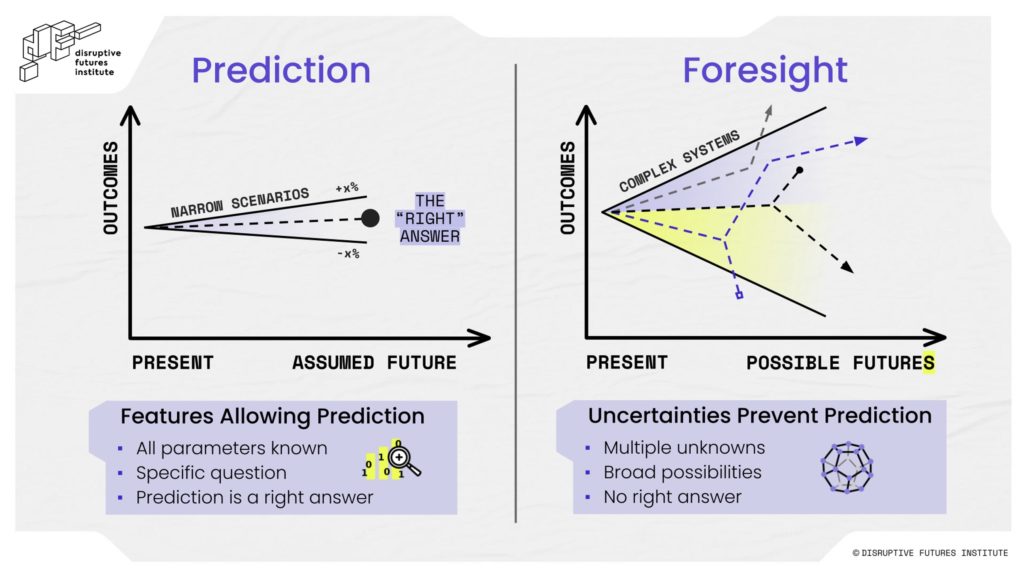 Futures mindsets do not preclude the use of assumptions. However, with foresight, we are not looking for a predetermined answer or specific outcome. Foresight is the capacity to explore the possible futures systemically, as well as drivers of change, to inform short-term decision-making.