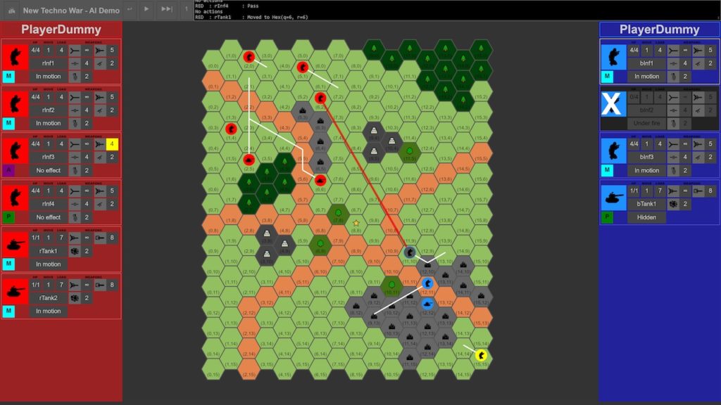 Version numérique du jeu de plateau New Techno War 2020 permettant à deux joueurs humains de s'affronter ou de faire combattre l'un d'entre eux contre une intelligence artificielle bleue (défenseur) ou rouge (attaquant). Cette version permet également à différentes IA de s'affronter les unes contre les autres. La faiblesse actuelle du système est le manque de compréhension et d'explication des décisions prises par l'IA au cours des différentes séquences du jeu. Il n'est donc pas surprenant que ce sujet, connu sous le nom d'"IA explicable", fasse partie des recherches en cours.