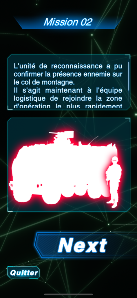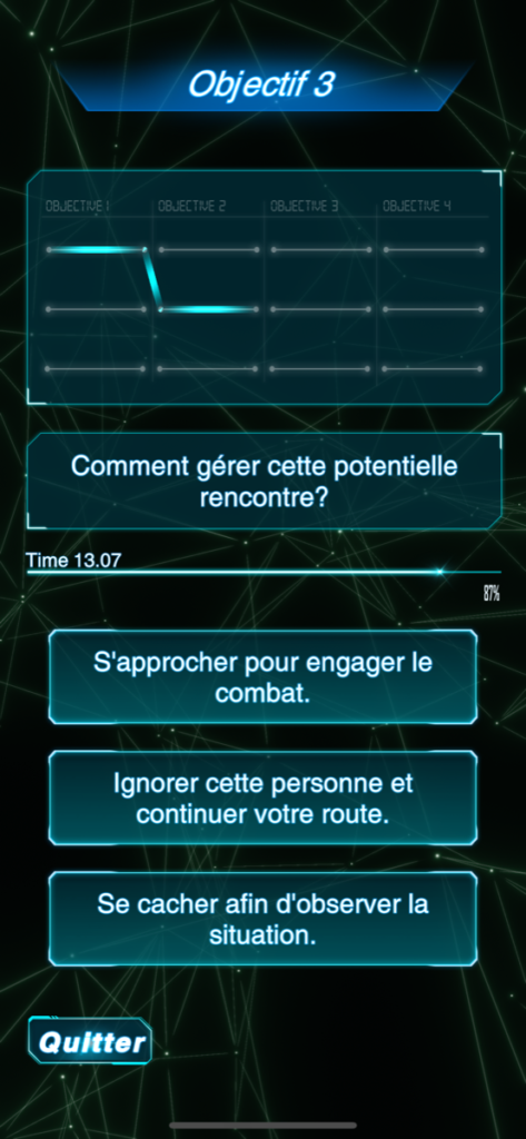 It seemed therefore appropriate to give this video game an application format that can be downloaded to a smartphone. If Soldier’s Companion presents to the player different strategic choices related to the use of new technologies in a context of armed conflict, the application explores yet another aspect of the future of military activity. As smartphones have become the “companions” of everyday life, it was decided to explore the relationship that a soldier could have with an artificial intelligence supporting him·her in his·her decision-making process.