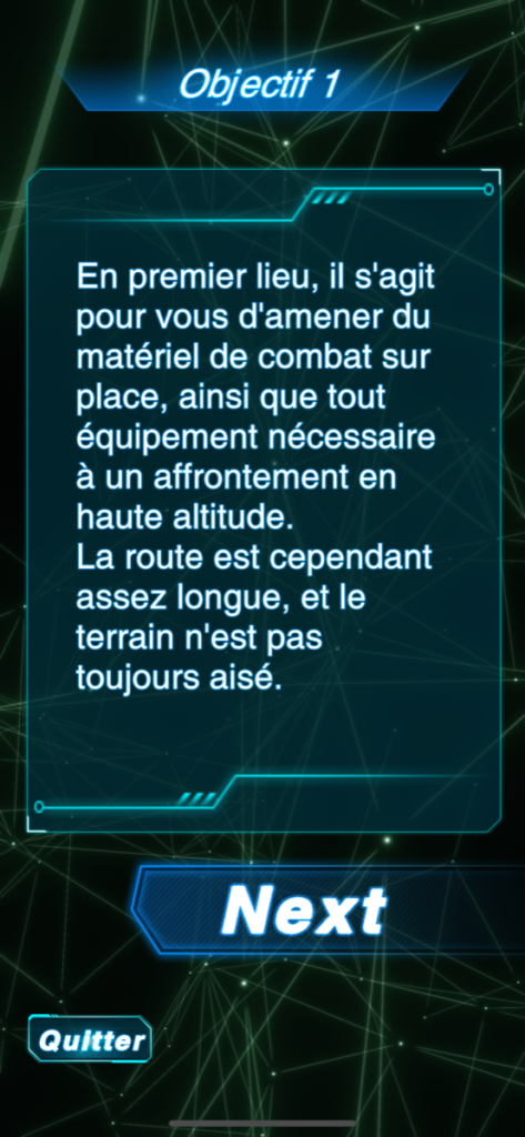 Soldier’s Companion works on the basis of the Game Books. Concretely, a narrative situation is given to the player in the form of the text of a mission briefing. Each mission unfolds into four objectives, or micro-situations, which present choices to the player. The player must simply decide on the best option that is presented. Eeach choice guide him·her to a new objective. In addition to his·her knowledge with respect to new technologies (drone, exoskeleton, autonomous vehicle, artificial intelligence), the player is helped by a digital assistant – called “Companion” – who provides him·her with clues to detect the optimal response.
