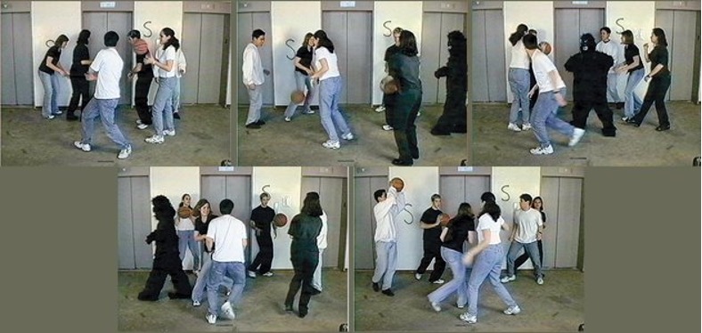 Le protocole est simple : deux équipes de basket sont mélangées (une habillée en blanc, une en noir) et se font des passes. On demande aux participants de compter les échanges de l’équipe blanche. Au bout d’une minute, les participants annoncent le nombre d’échange, sans erreur. Mais 50% n’ont pas vu le gorille noir qui s’était mélangé aux joueurs !