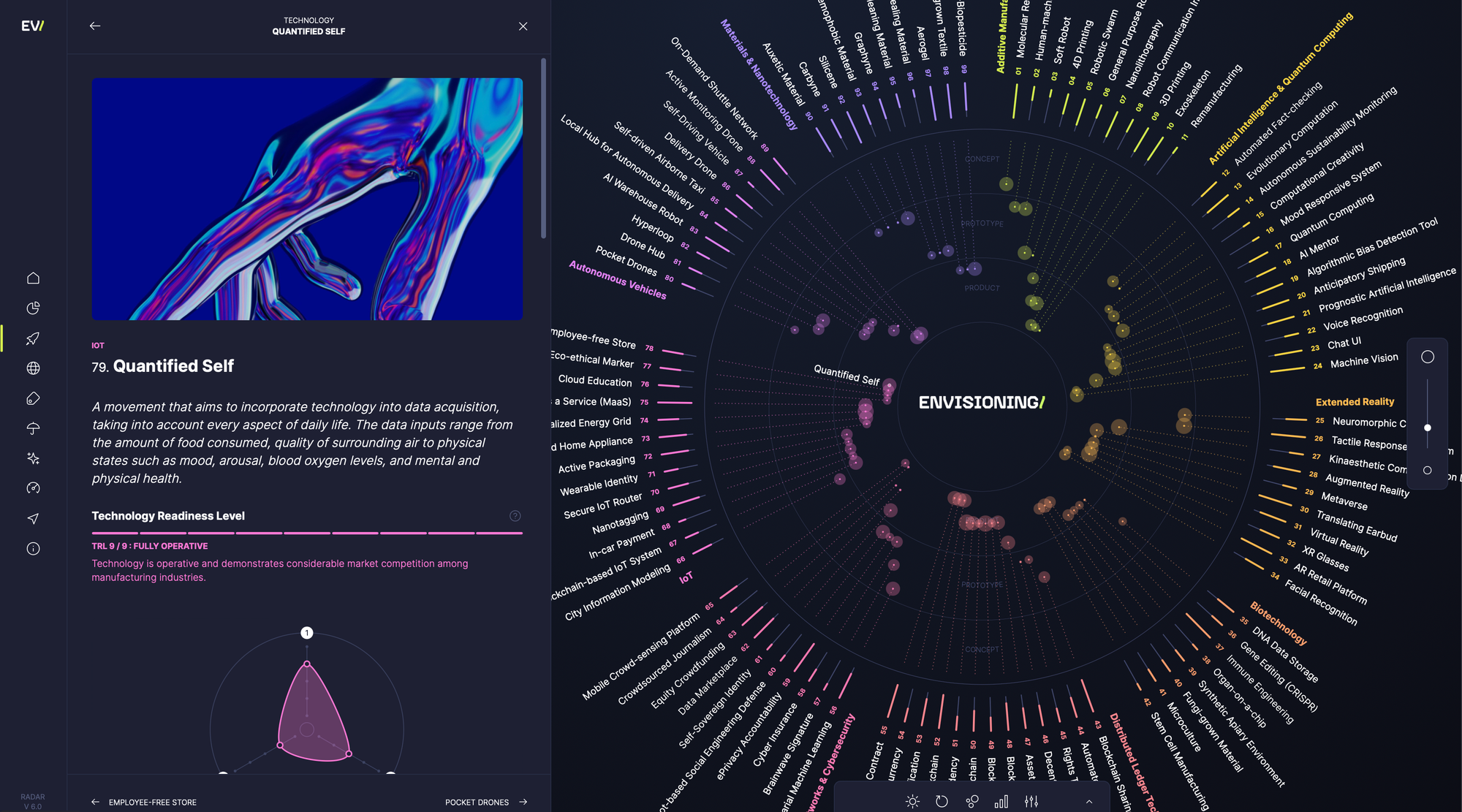 At Envisioning, our Radar interface leverages many of these principles and assists users in navigating complex data sets. Our research focuses on the impact of emerging technology on many aspects of the future. We track many measurable aspects of technology signals, and work with organizations in mapping potential futures.
