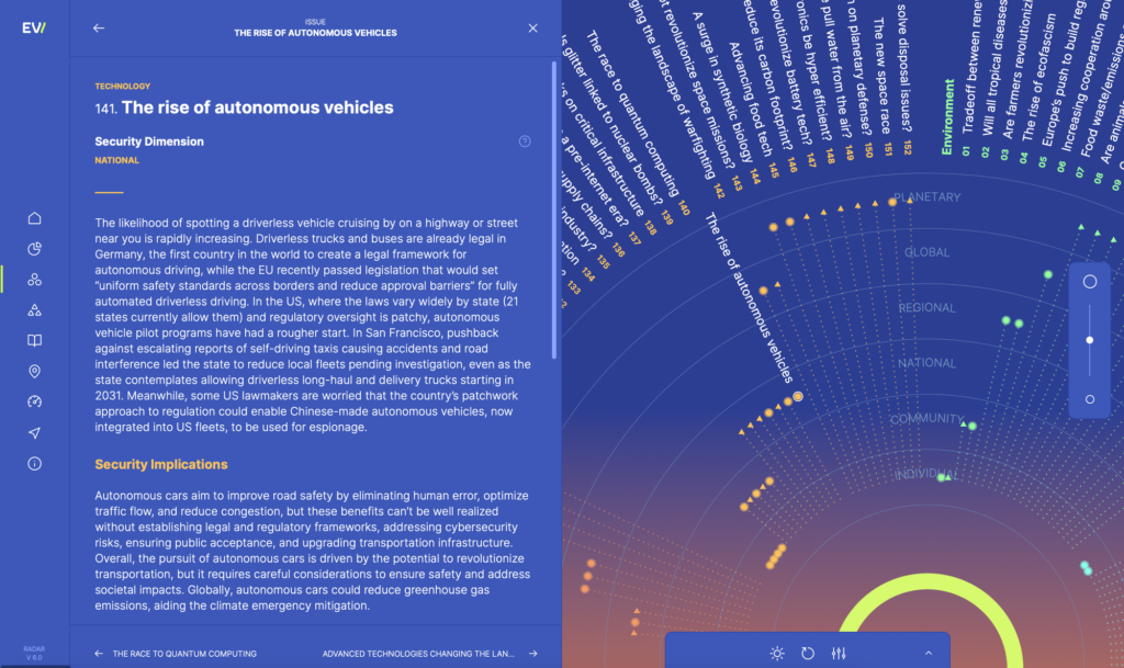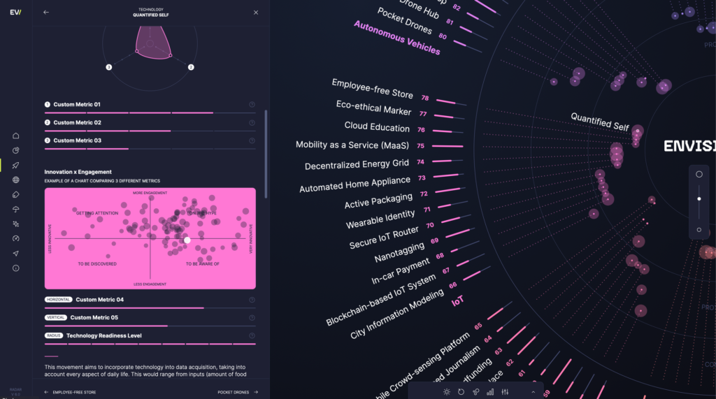 Chez Envisioning, l’interface Radar s’appuie sur plusieurs de ces principes et aide les utilisateurs à naviguer dans des ensembles de données complexes. Les recherches se concentrent sur l’impact des technologies émergentes sur de nombreux aspects de l’avenir. Nous suivons de nombreux aspects mesurables des signaux technologiques et travaillons avec des organisations pour cartographier des futurs potentiels.