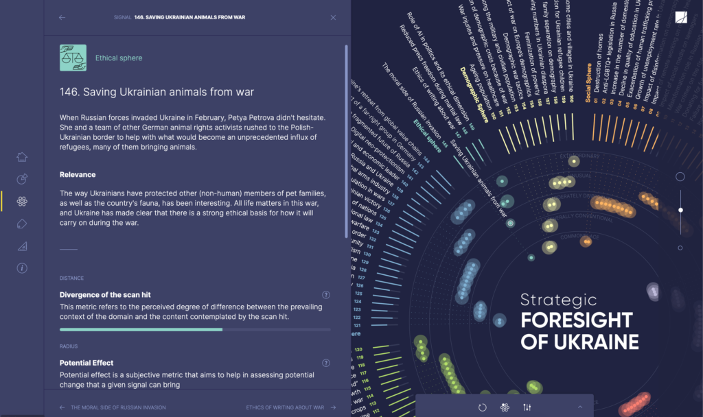 For the Strategic Foresight group at the Parliamentary level of Ukraine, together with a team of futures intelligence signal scouts and foresight experts, we helped organize and visualize hundreds of signals of change likely to affect the future of Ukraine.