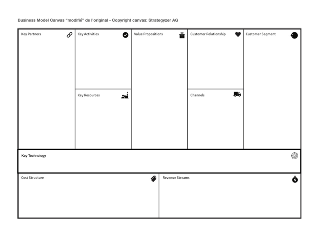 Comme je vous le partageais, j’ai utilisé le canevas dit BMC à maintes reprises et ai fait un ajout simplement afin d’aider les parties prenantes à se rappeler que les technologies sont des ressources clés du modèle d’affaires. Cela consiste en un 10ème élément intitulé “Technologies Clés”. Cette petite modification force ainsi les utilisateurs à sortir des idées générales sur la technologie et à découvrir une version augmentée de son utilisation et ses effets sur le modèle d’affaires.