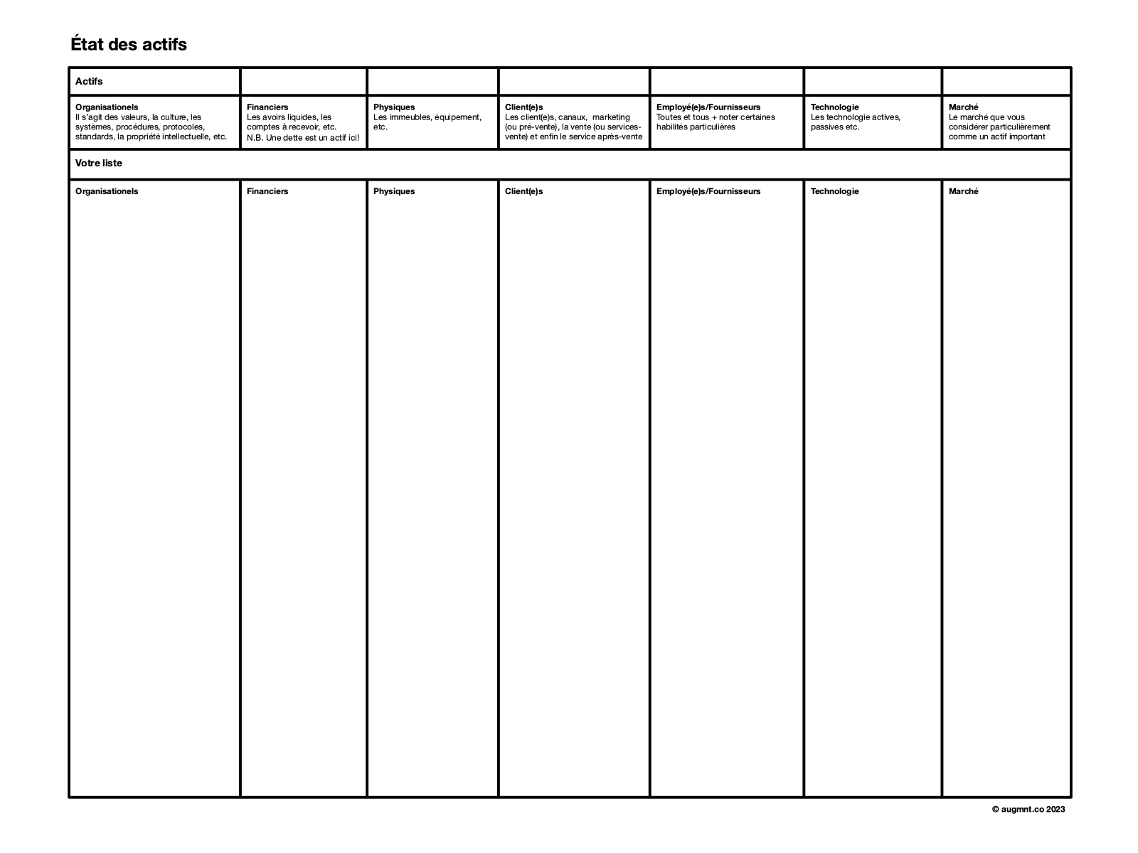 Je propose de le nommer l’État des Actifs, qui permet d’inventorier les actifs dits clés qui créent les résultats financiers. Cet état a fait ses débuts comme une liste de vérification et d’inventaire lors de ventes d’actifs, de fusion et de financement tant privé que public. Cet état permet d’avoir une vue totale (en principe) des actifs de l’entreprise en lui permettant d’entreprendre un inventaire rigoureux et précis de ses actifs “tout venant”. Tout ce travail fait l’objet de notre approche introspective.
