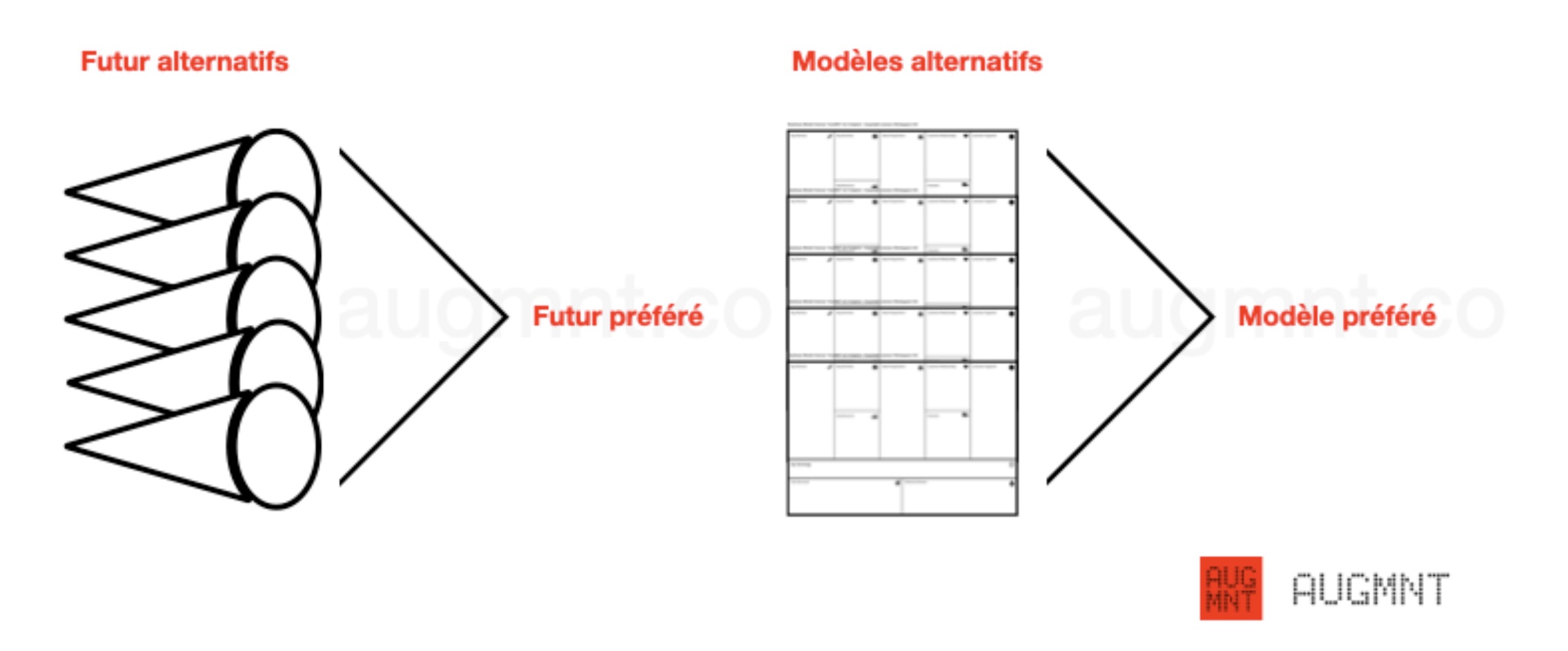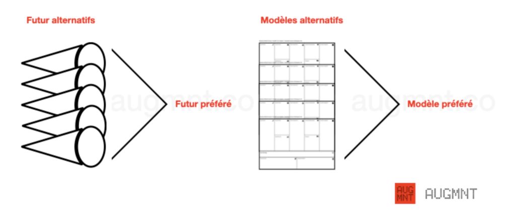 Puisque l’analyse prospective nous suggère l’utilisation de futurs alternatifs afin de sélectionner notre futur préféré, nous suggérons la même approche afin de sélectionner notre modèle préféré.