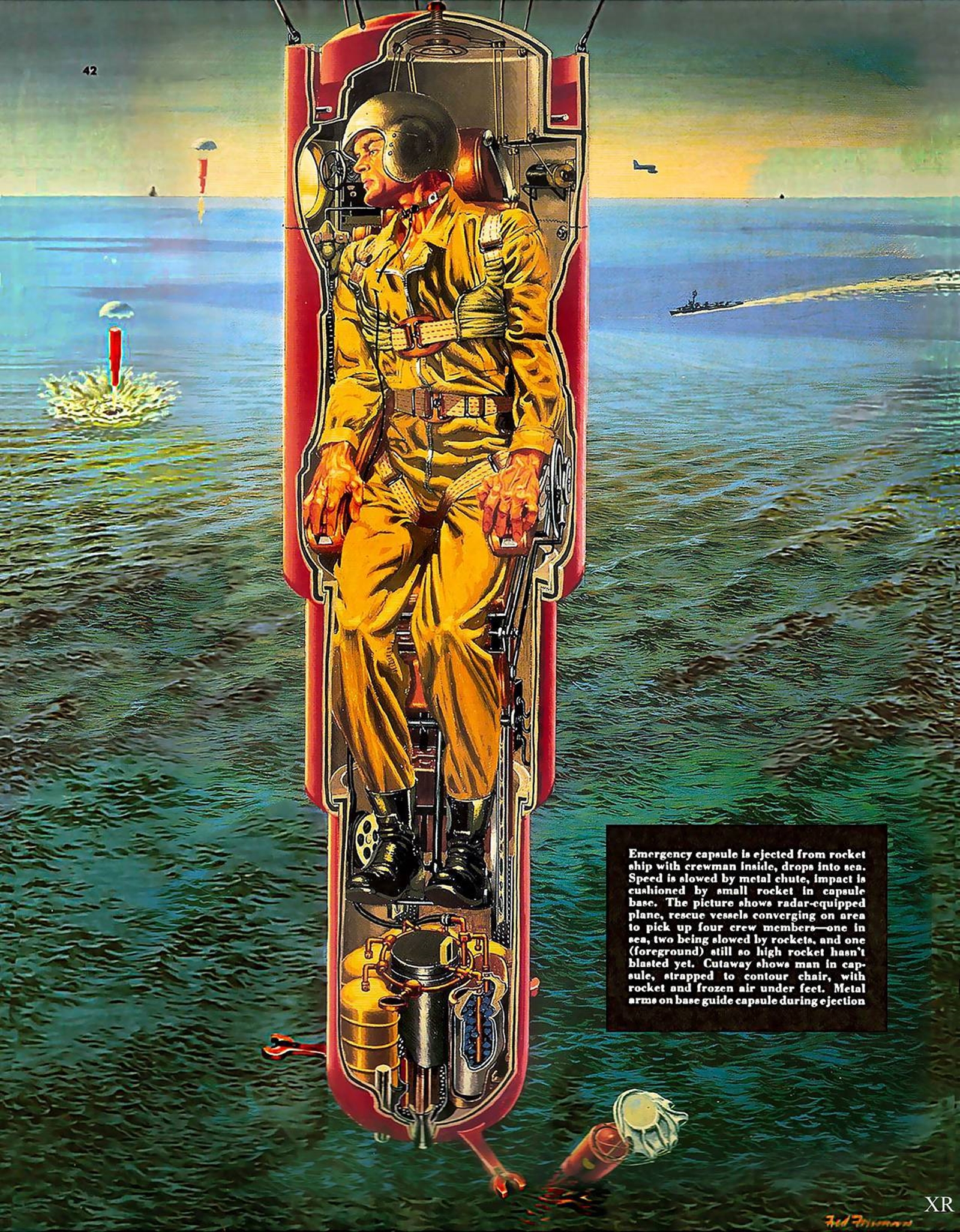 Ces articles sont accompagnés d’images créées par Chesley Bonestell, illustrateur majeur de la science-fiction. Cette alliance inédite en termes de communication joue justement sur cette frontière intangible entre le possible et l’impossible, le réel et la fiction.