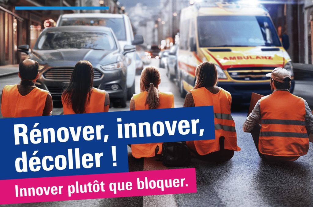 With a subtitle that emphasises « innovate rather than block », it shows five activists blocking traffic in a city-centre street, preventing an ambulance from getting through.