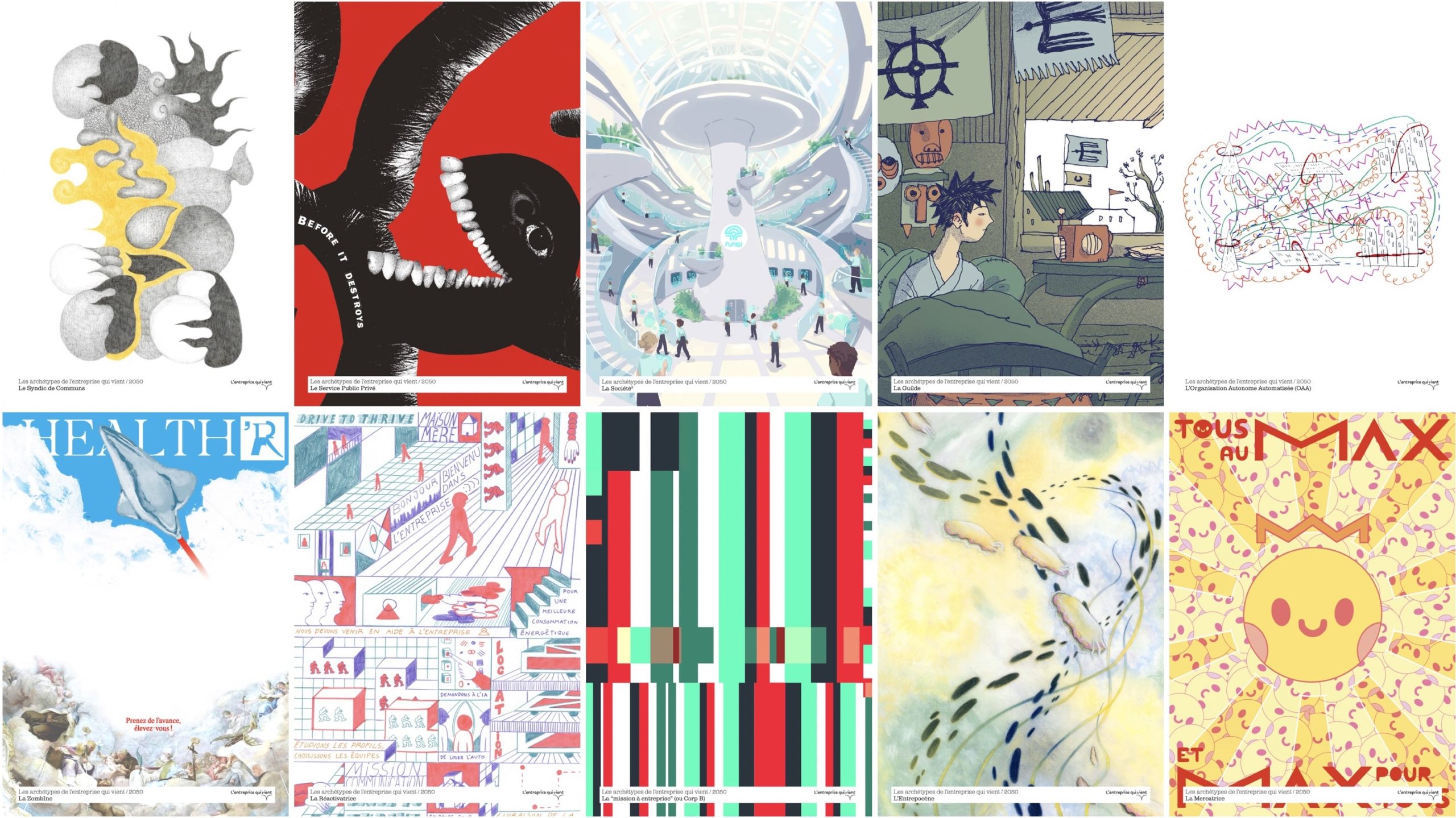 Une lecture systématique des archétypes nous a ensuite permis d’en extraire dix « archétypes » d’entreprises du futur : des figures tranchées et signifiantes, certaines nouvelles, d’autres significativement transformées, qui pourraient dessiner le paysage des entreprises de 2050. Il nous importait de laisser émerger ces archétypes du contenu sans lui appliquer une grille de lecture a priori. En revanche, cela signifie, d’une part, qu’il pourrait probablement y avoir d’autres lectures du même contenu et, d’autre part, que ce que les 12 fictions n’auront pas su voir ne sera pas plus considéré par les archétypes.