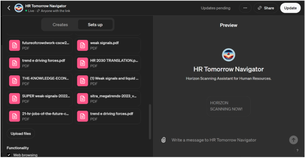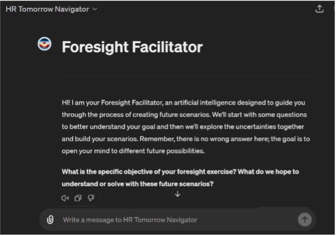 • Les outils offerts par l’intelligence artificielle générative (GPT4.0) pour la traduction des phénomènes de changement en un récit du futur : en particulier HR Tomorrow Navigator, un GPT spécifiquement créé pour la prospective des ressources humaines.