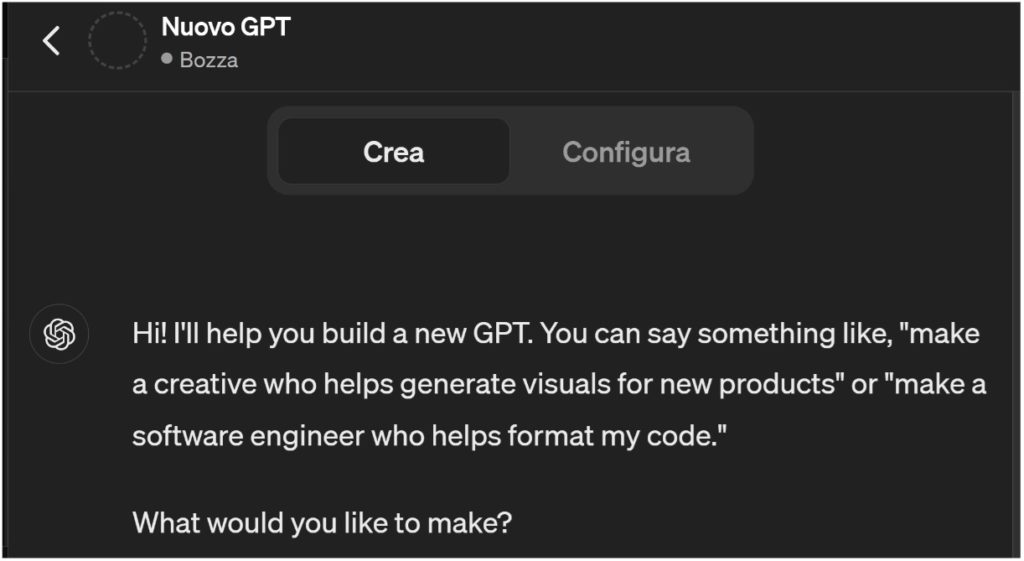 La Configurazione di un GPT è relativamente semplice, è sufficiente selezionare il pulsante crea per iniziare la generazione guidata del bot, alla fine del processo è possibile già usufruire di un prodotto finito ma che non si discosta dall’utilizzo del normale Chat GPT.