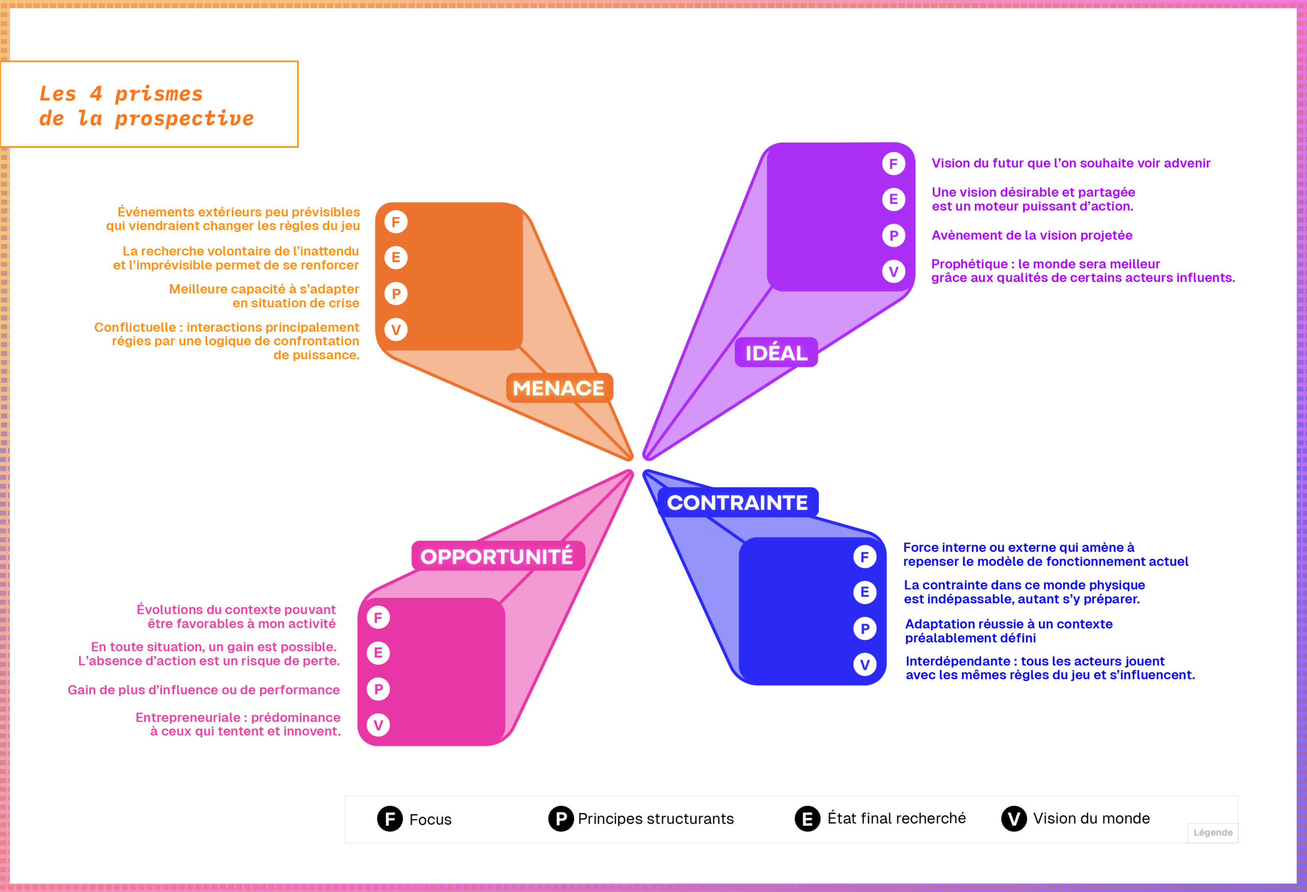 Maintenant que nous avons commencé à nous intéresser au « comment » anticiper, notamment en identifiant les grandes phases de l’activité d’anticipation, nous allons nous pencher sur ce que nous appelons les prismes, c’est-à-dire, les différentes manières d’appréhender les futurs.