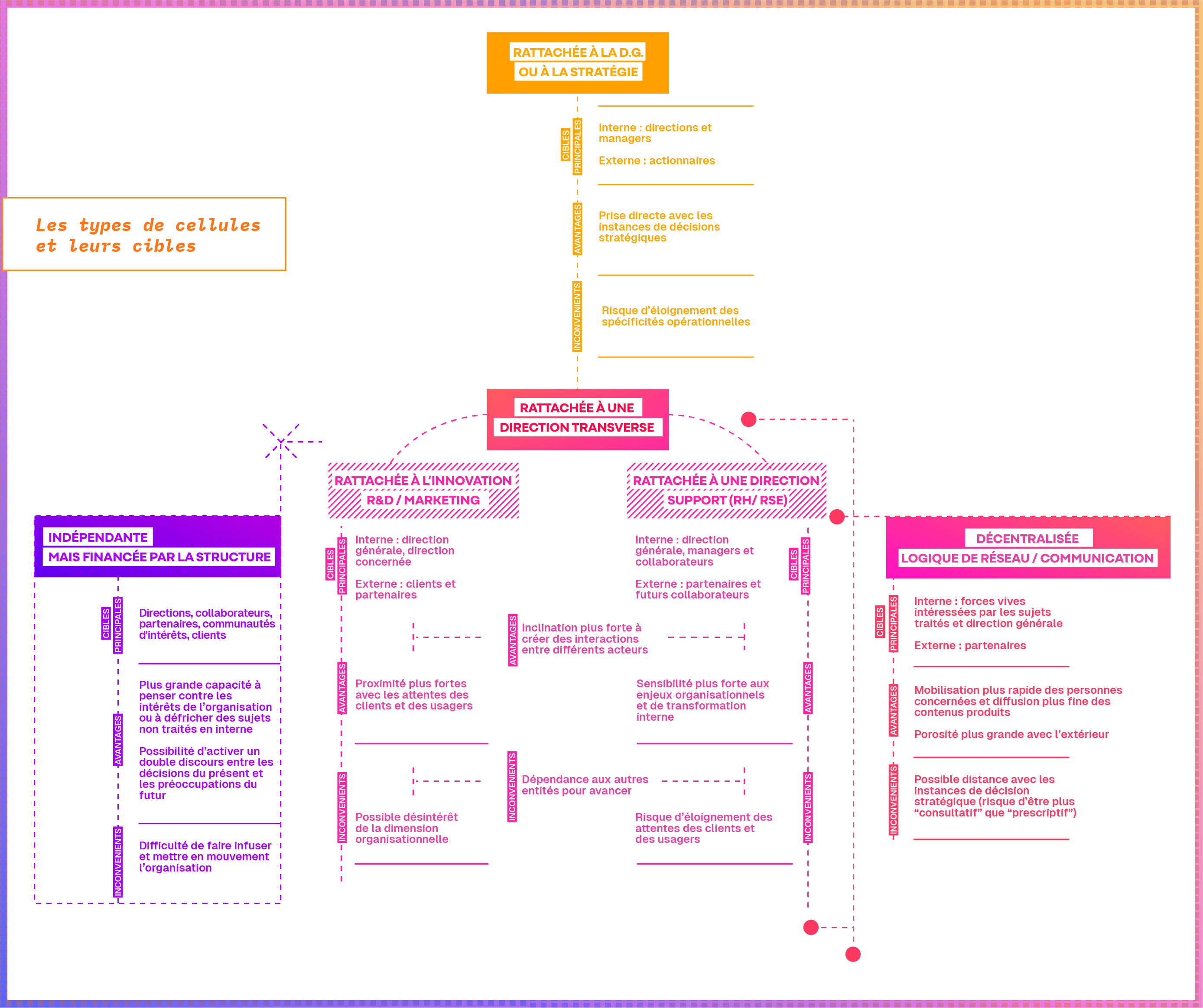 | Avantages | Prise directe avec les instances de décisions stratégiques | Inclination plus forte à créer des interactions entre différents acteurs | Mobilisation plus rapide des personnes concernées et diffusion plus fine des contenus produits Porosité plus grande avec l’extérieur | Plus grande capacité à penser contre les intérêts de l’organisation ou à défricher des sujets non traités en interne Possibilité d’activer un double discours entre les décisions du présent et les préoccupations du futur | |