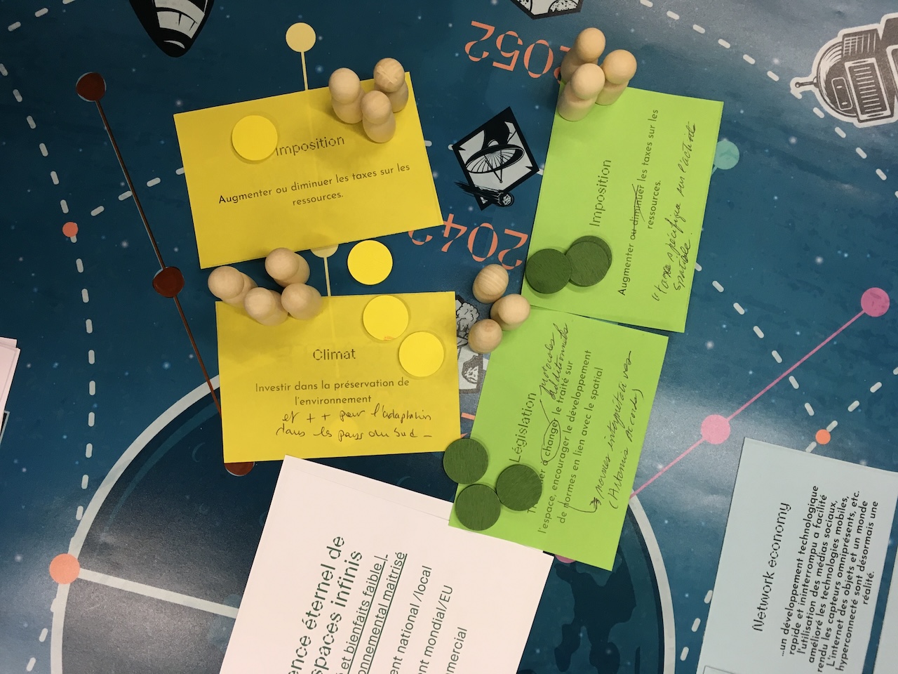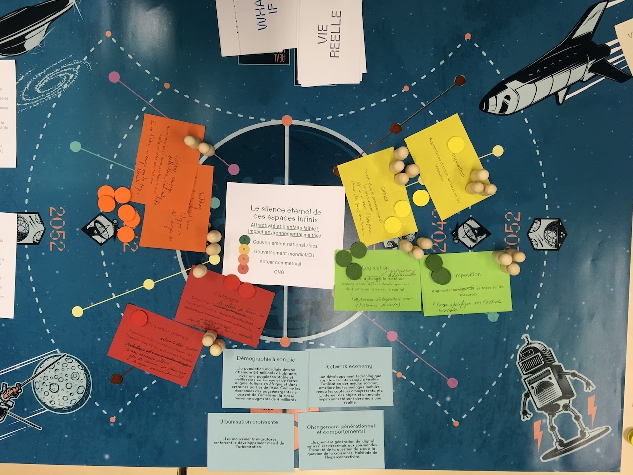 - Compréhension des interactions entre acteurs : Le jeu permet de visualiser concrètement comment les actions des différents acteurs influencent le développement des scénarios. Par exemple, dans notre atelier sur les loisirs spatiaux, le rôle de la société civile est apparu plus clairement, ainsi que les différentes forces en présence qui pourraient jouer un rôle de transformation.
