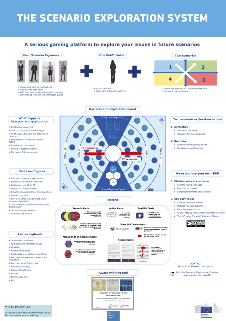 Le SES (Scenario Exploration System) est un jeu de plateau développé par le JRC – Joint Research Center -, un organisme de recherche de la Commission Européenne qui soutient l’élaboration de politiques publiques via la prospective.