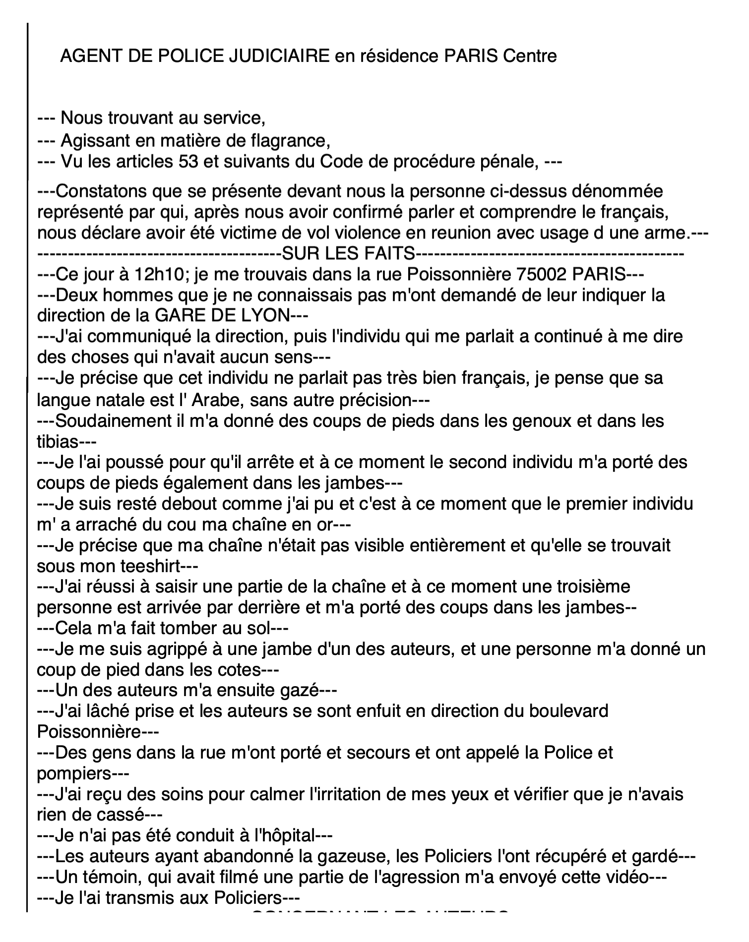 Finalement, merci à la police municipale parisienne pour leur prompte intervention et leur efficacité dans la coordination pour la récupération d’images de différentes sources vidéo ainsi que pour avoir pris ma déposition en un temps record.