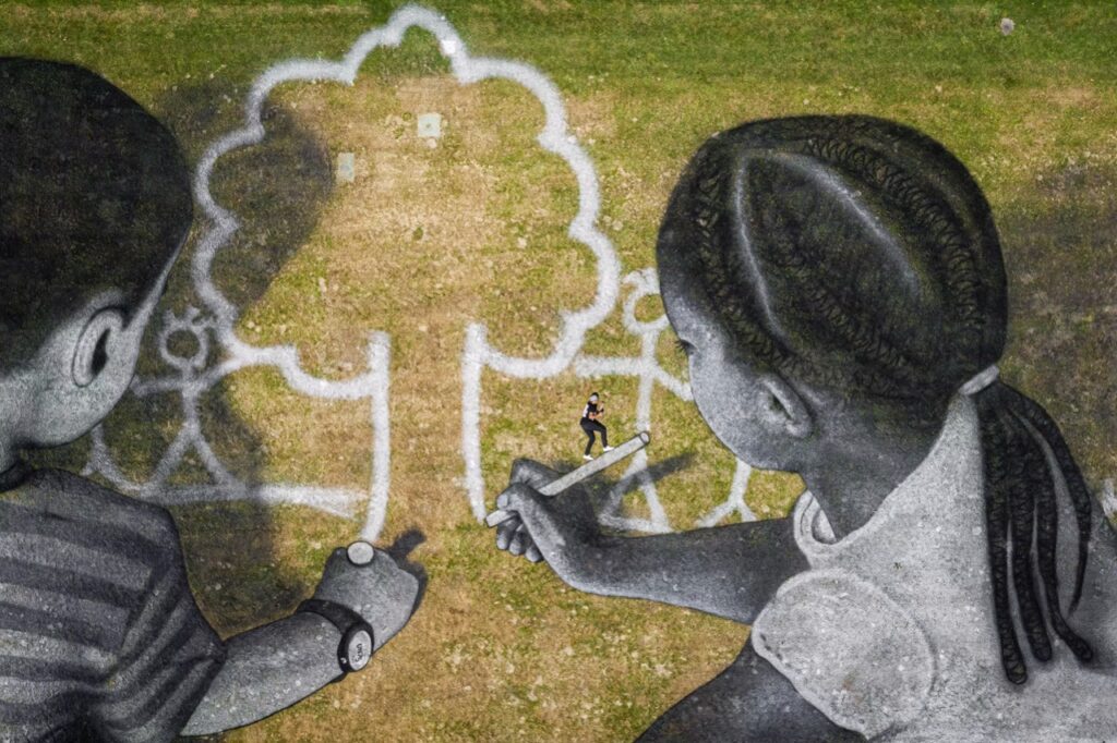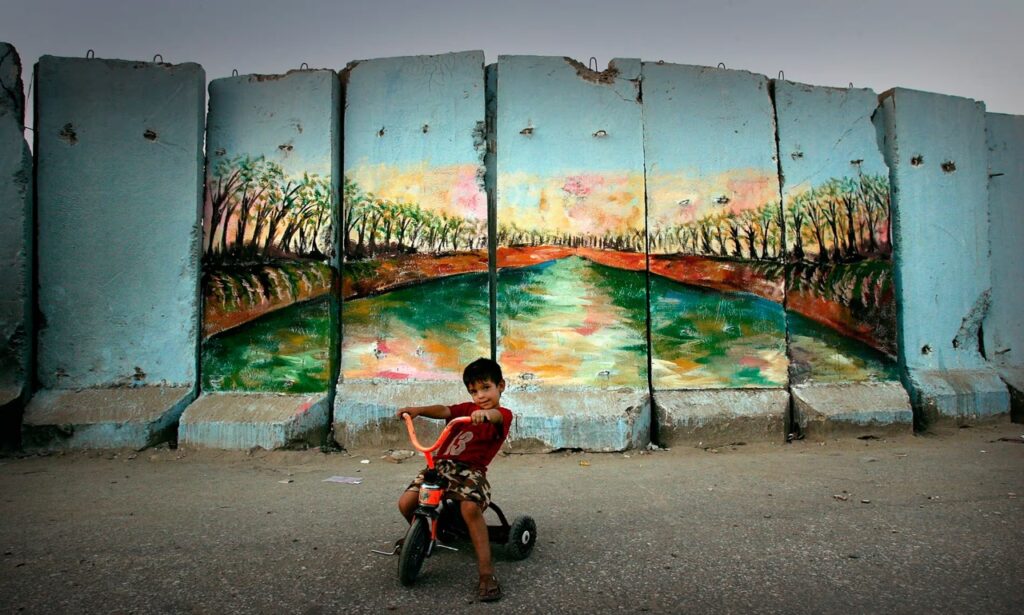 Un enfant irakien assis devant un "mur de sécurité" peint à Bagdad, Irak. Photographie : Wathiq Khuzaie/Getty Images. Source : The Guardian