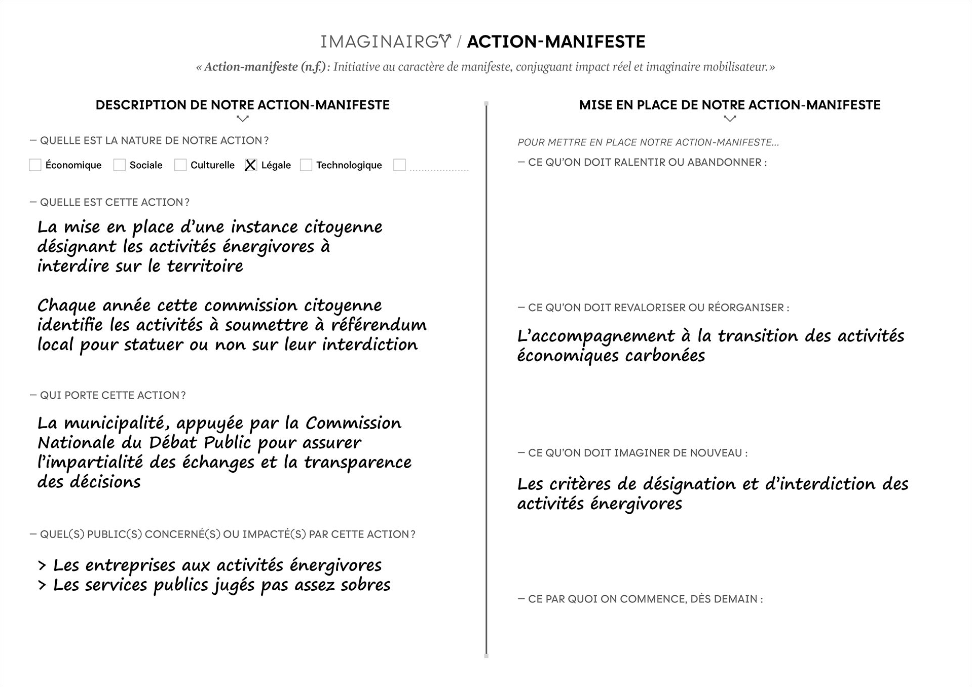 It’s one of the core pillars of both the approach and the toolkit: enabling appropriation of the scenarios to lead to “manifesto-actions” — initiatives with the symbolic weight of a manifesto, combining tangible impact on energy consumption with a unifying imaginary to support the transition.