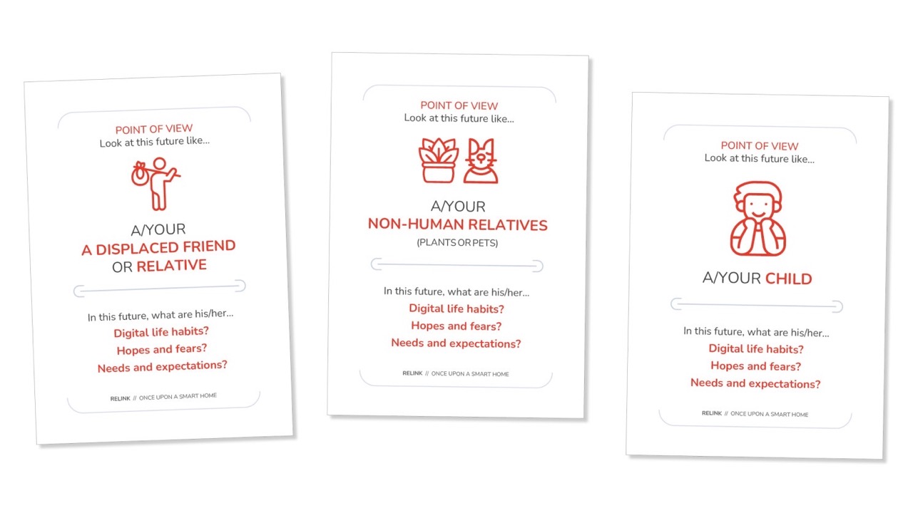 The "Point-of-View" cards from the Once Upon A Smart Home playful toolkit (Relink / OsloMet University) invite users to adopt alternative perspectives in order to explore the risks and vulnerabilities embedded in connected households.