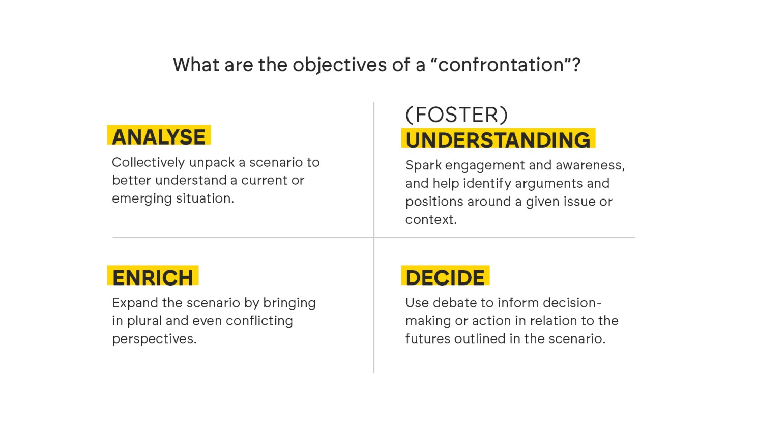 We based our work on a typology of confrontation goals to offer a range of ways to activate speculative scenarios.