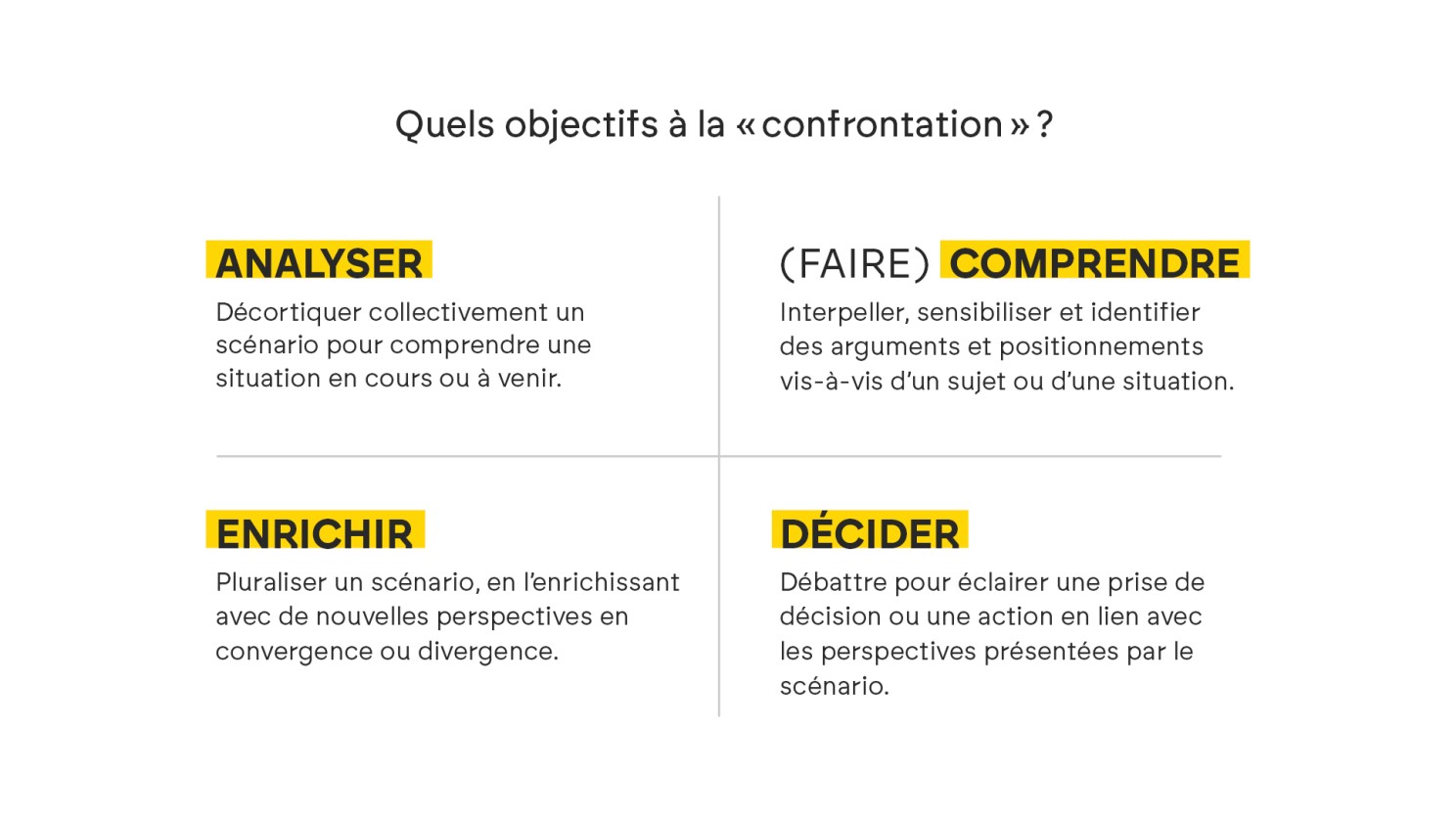 Nous nous sommes appuyés sur notre typologie d’objectifs de confrontation pour proposer différents modes d’exploitation des scénarios spéculatifs.