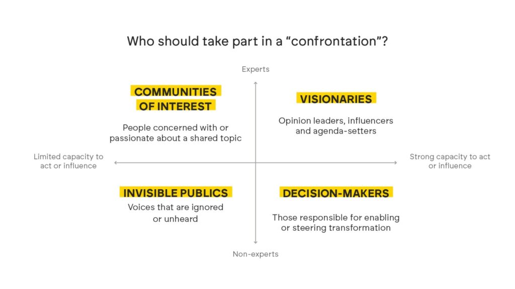 La « confrontation » est ce moment magique où les futurs entrent en collision avec le présent. Une vision de demain, racontée à travers un récit, un objet ou une expérience fictionnels, rencontre le vécu bien réel de son audience. Dans le même temps, les réalités concrètes de ce public se frottent aux perspectives possibles pour demain, générant ainsi une tension fertile entre actualité et anticipation.