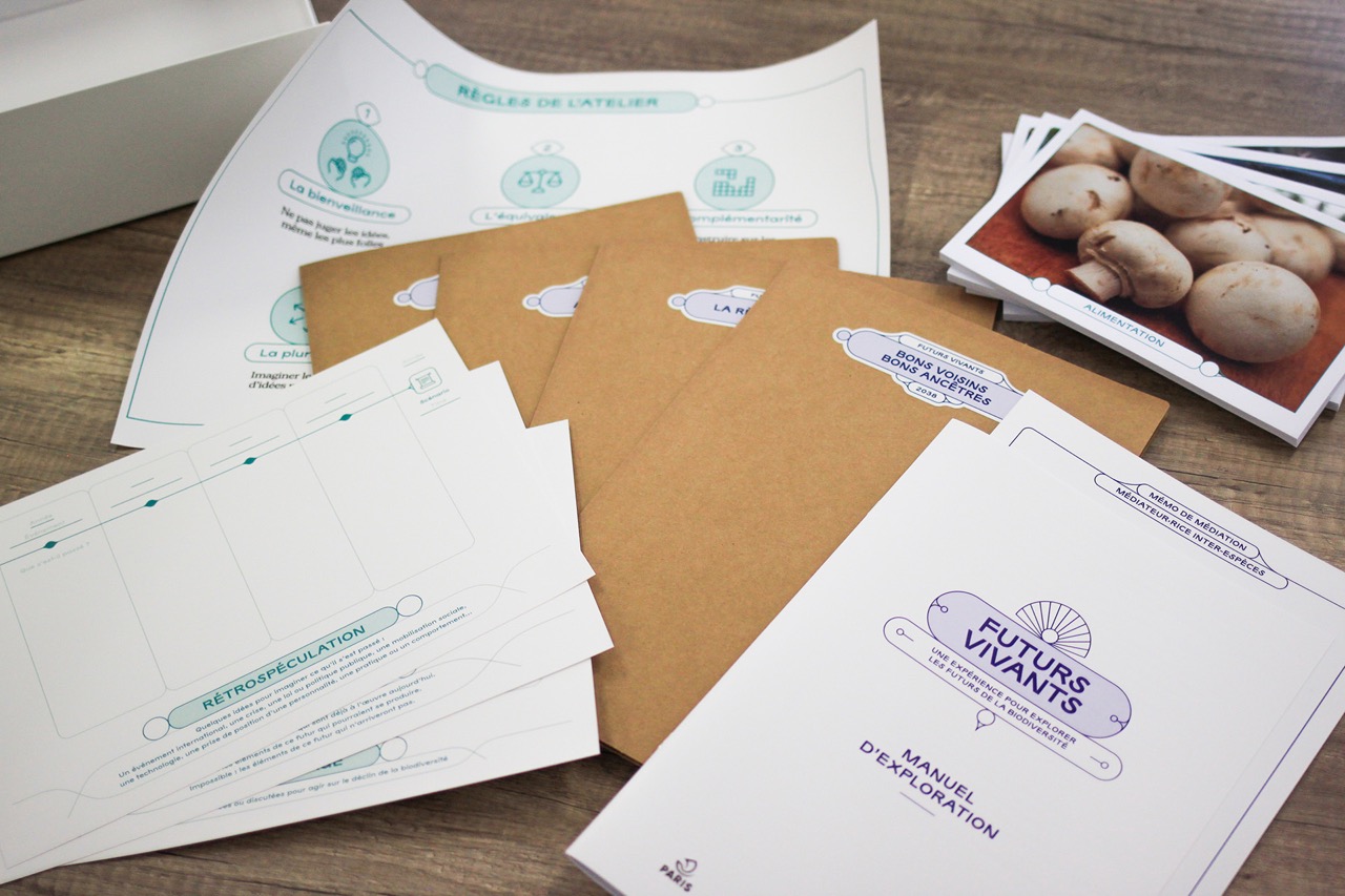 Nous avons conçu une « boîte aux futurs » — contenant des ressources pédagogiques, des fictions et des artefacts spéculatifs — qui permet d’animer des ateliers immersifs et participatifs, invitant à réfléchir aux enjeux systémiques du vivant à Paris.