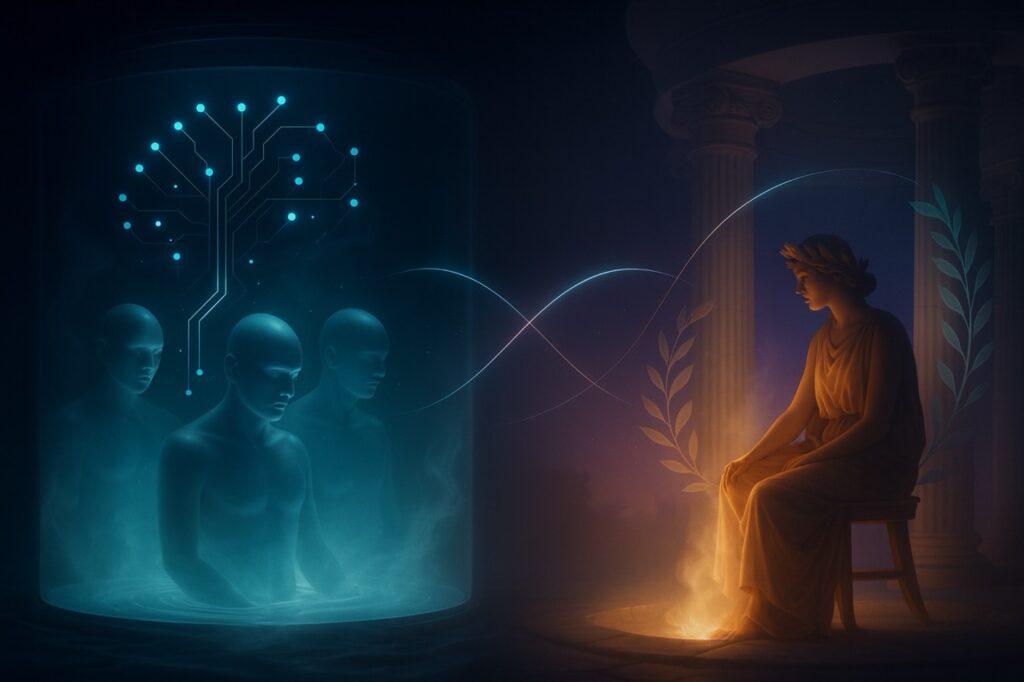 En érigeant l’IA au rang de Pythie ou de Precog, on lui confère, non le pouvoir de lire l’avenir, mais celui d’agir sur le présent – et donc sur l’avenir. Par ce fait même, la question de savoir si la prophétie était exacte ou non à l’instant de son énonciation devient sans objet.