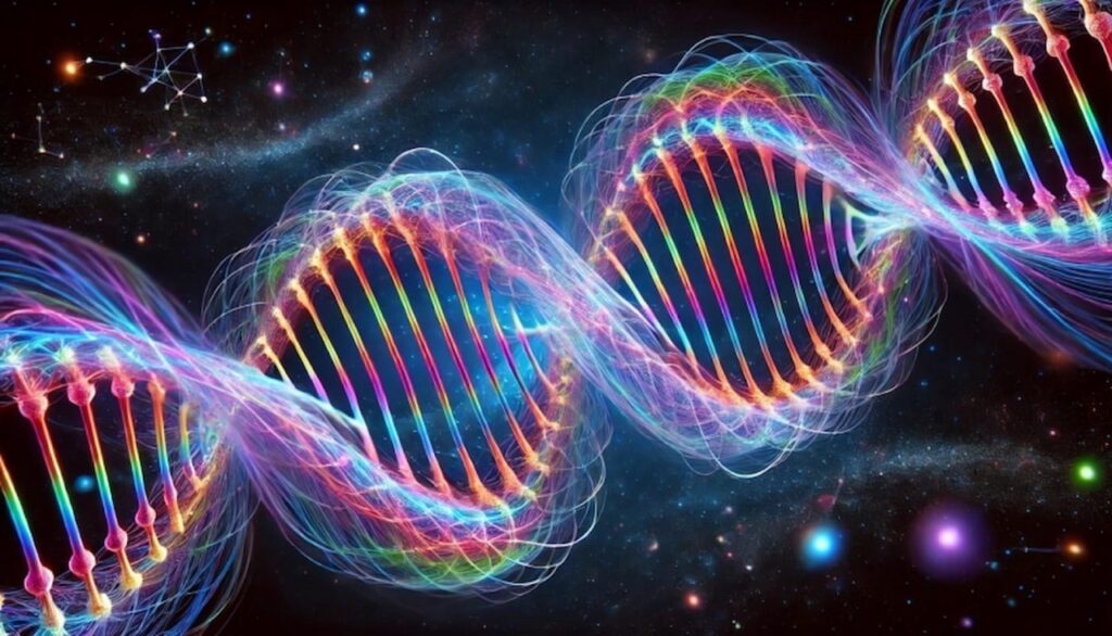 L’énergie disperse la vie, nous, à force d’impermanences ; se cristallise en spirales de grains de lumière dans l’ADN [12], synonymes de biodiversité culturelle humaine ou pollinisation non-humaine.
