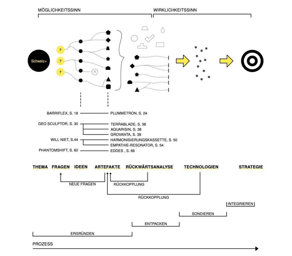 Grâce à la sélection ciblée et à l’organisation méthodique d’instruments éprouvés de la prospective, les visions spéculatives (ou design fiction), les analyses de tendances et les techniques de scénarios sont combinées d’une manière nouvelle.