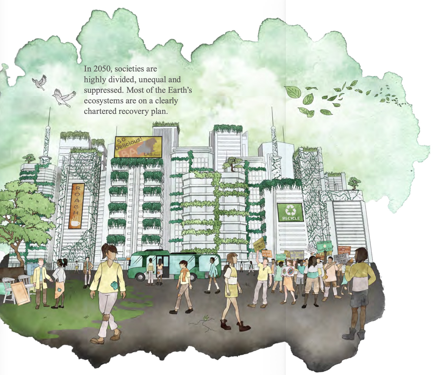 La deuxième illustration, au fond vert est légendée « 2050 Scenarios · Greentocracy » mais le texte dans l’illustration dit « In 20250, societies are highly divided, unequal and suppressed. Most of the Earth’s ecosystems are on a clearly chartered recovery plan ».
