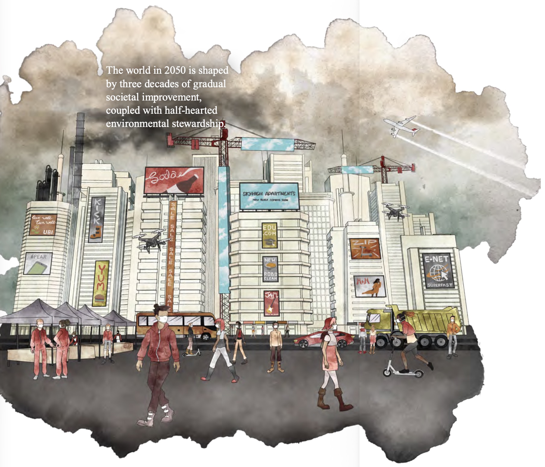 La troisième illustration par contre, au fond marron et avec des annonces publicitaires est légendée « 2050 Scenarios · Humans Inc » et le texte dans l’illustration dit » The world in 2050 is shaped by three decades of gradual societal improvement, coupled with half-hearted environmental stewardship ».