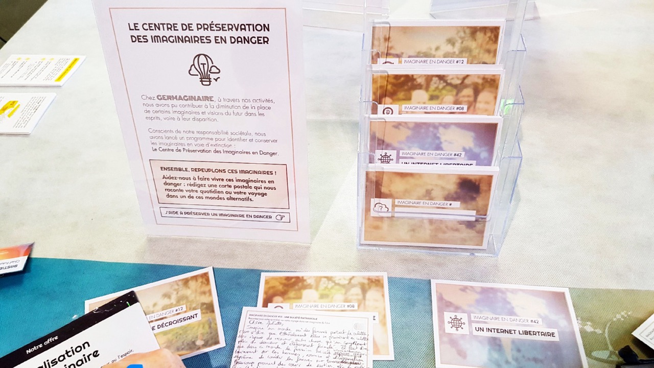 Une fois sa fictionnalité dévoilée, l’expérience de Germaginaire invitait les visiteuses et visiteurs à rédiger une carte postale racontant leur quotidien dans un monde où…